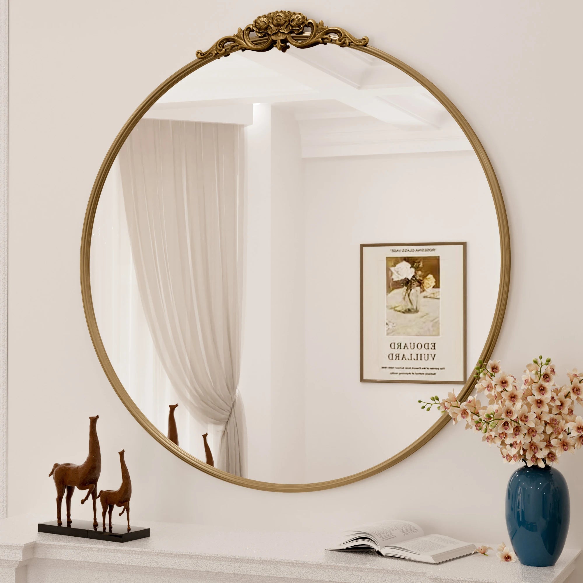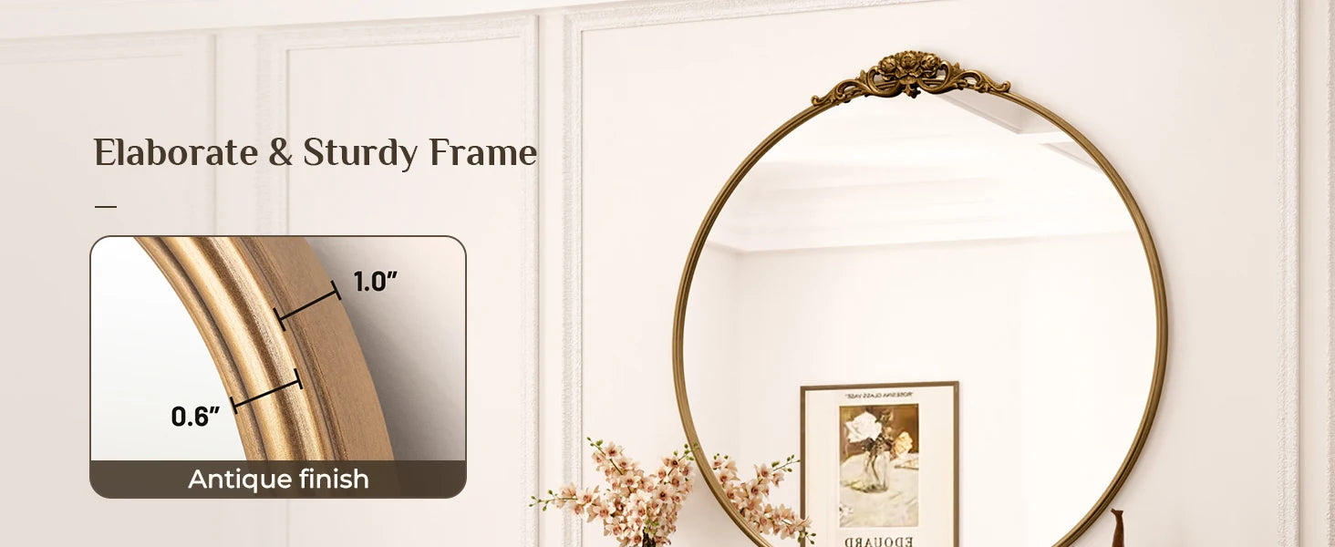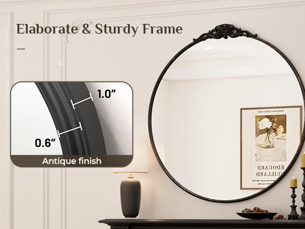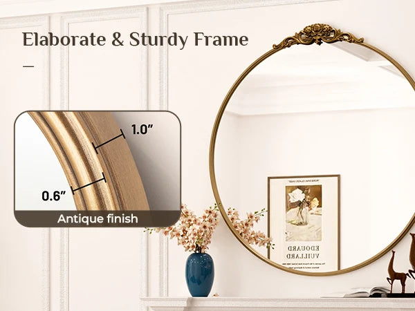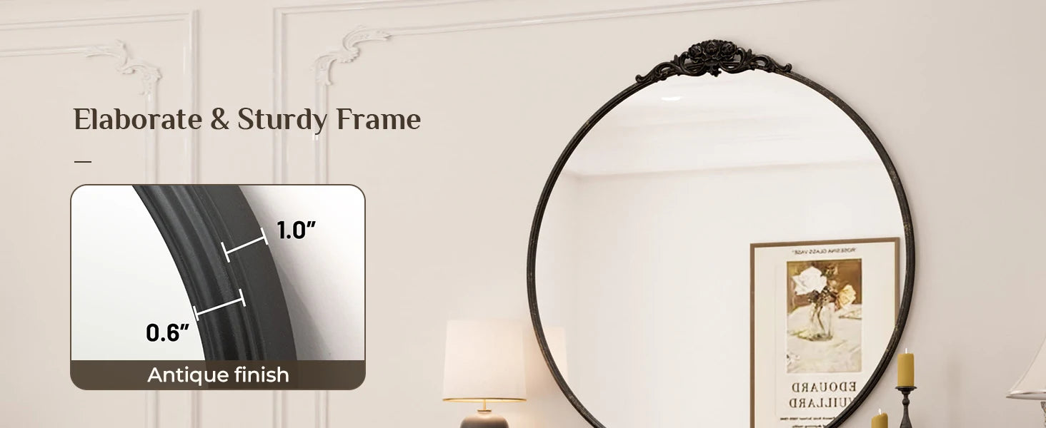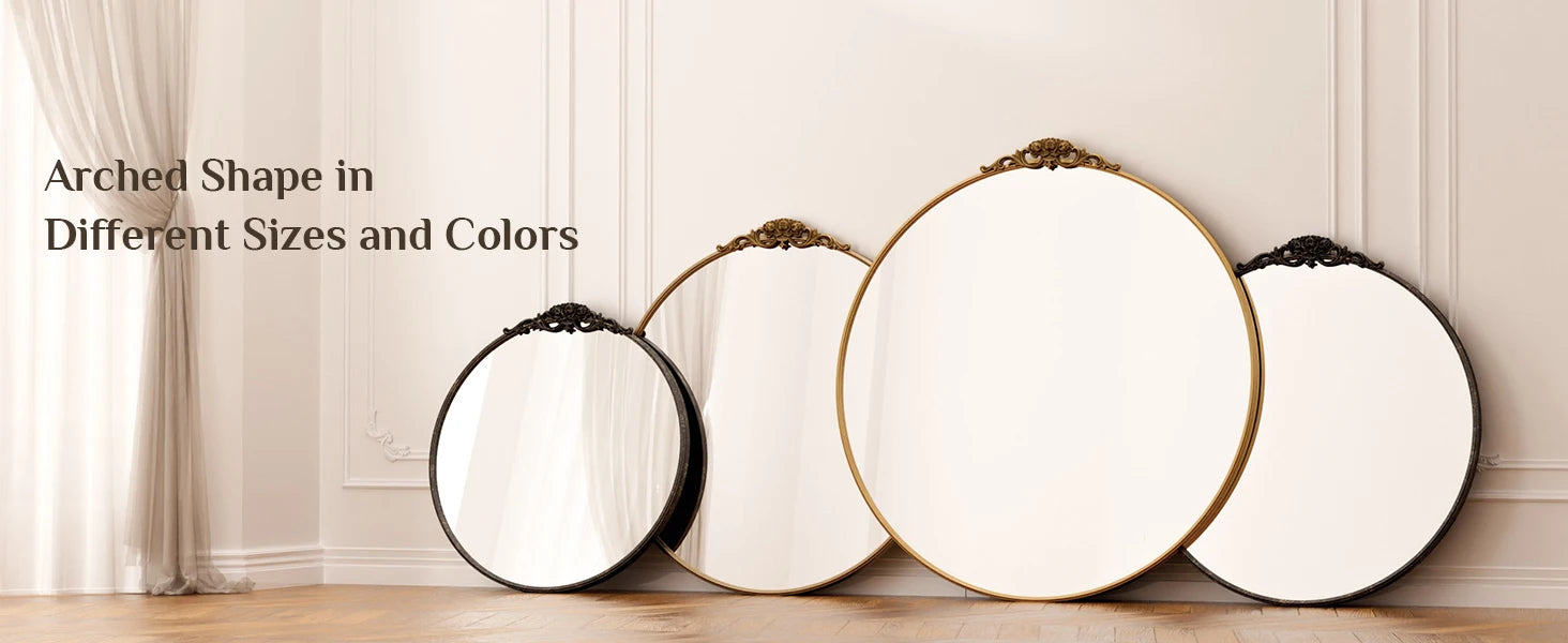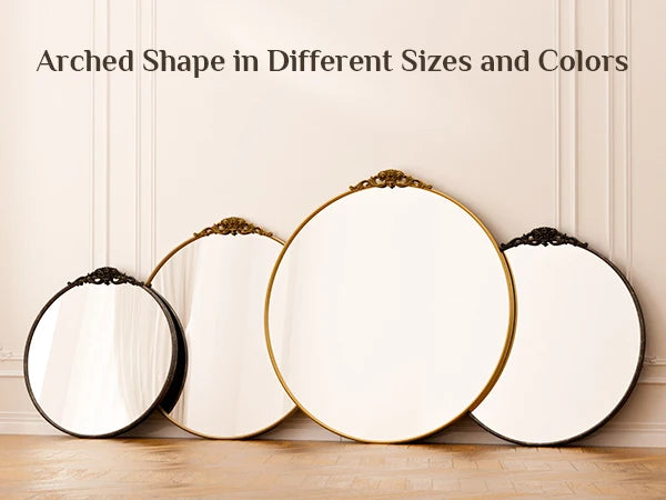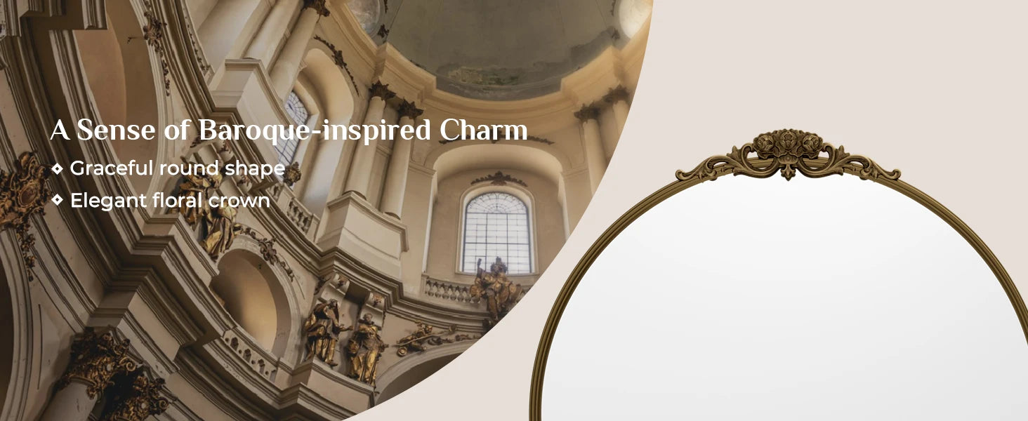 バロックの魅力にインスピレーションを得た時代を超越した円形デザインのラウンド アーチ ミラーは、どんな部屋もグレードアップする洗練された焦点を作り出します。