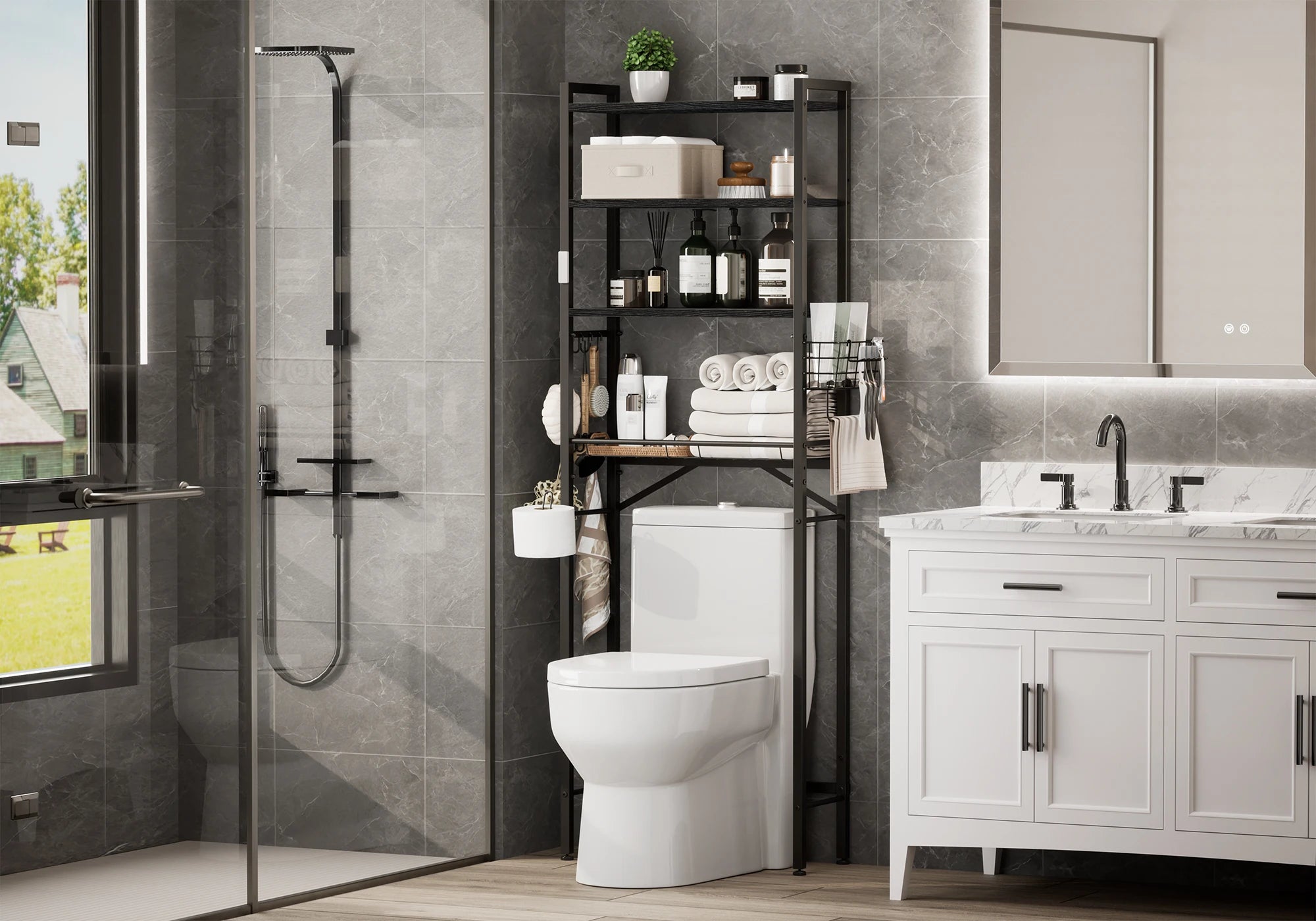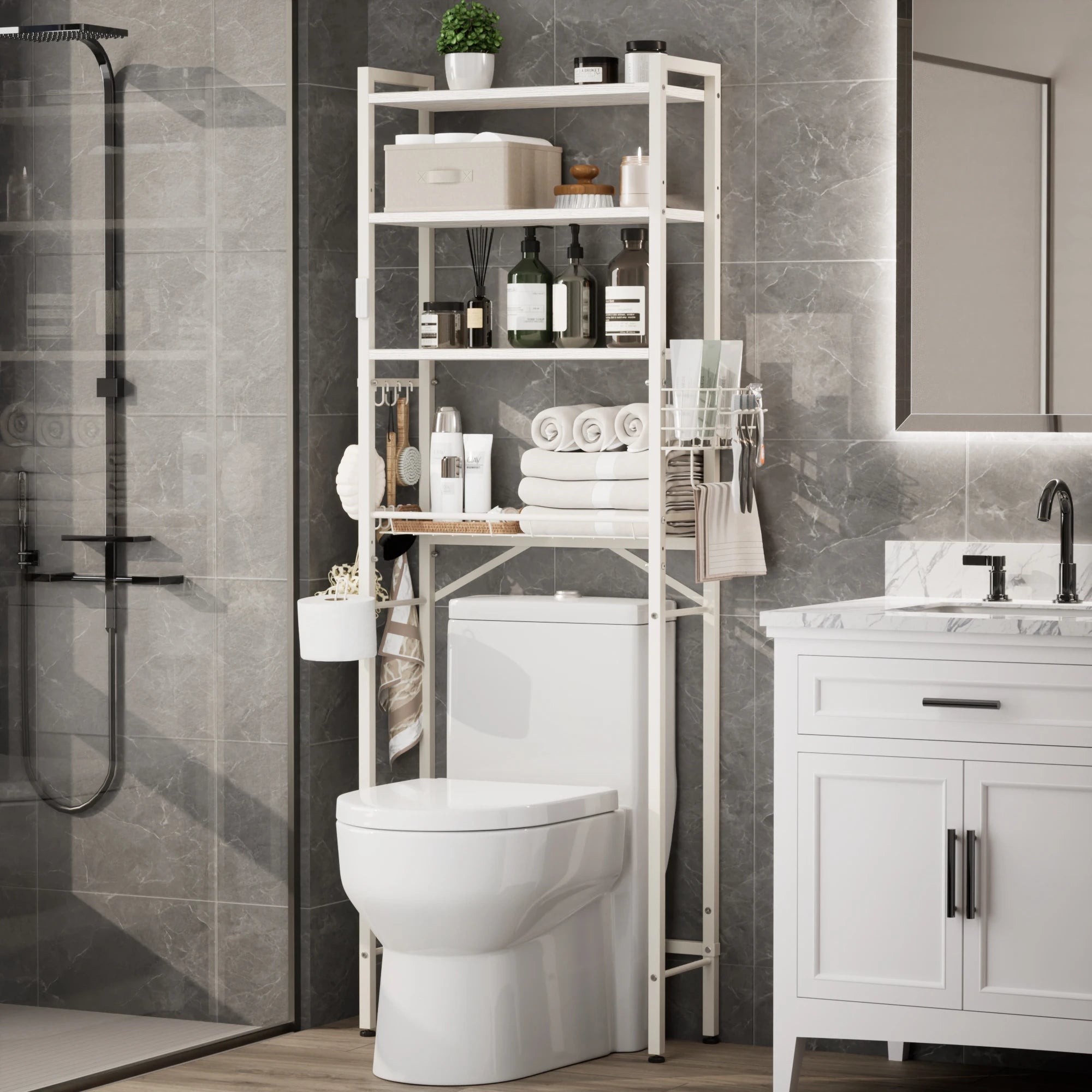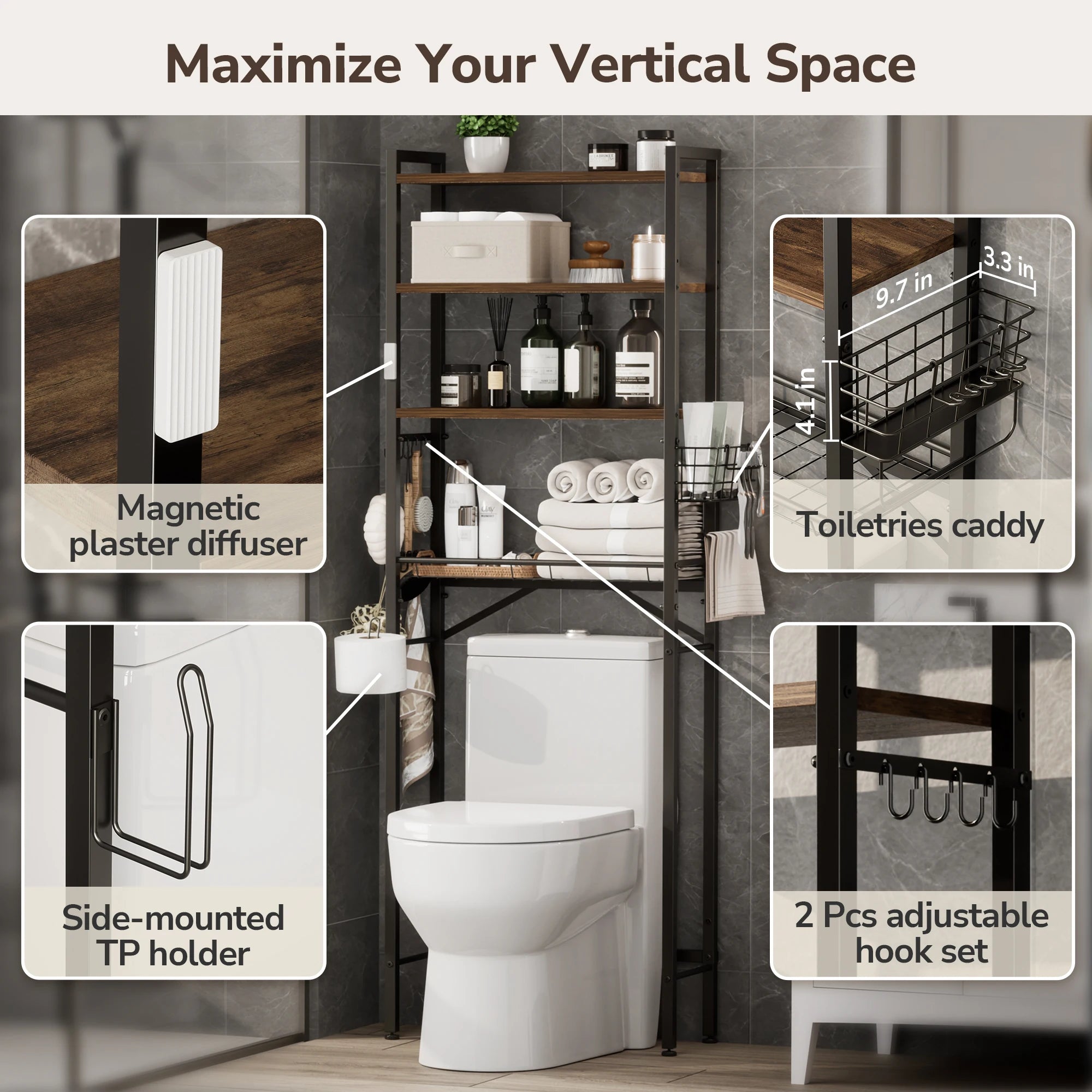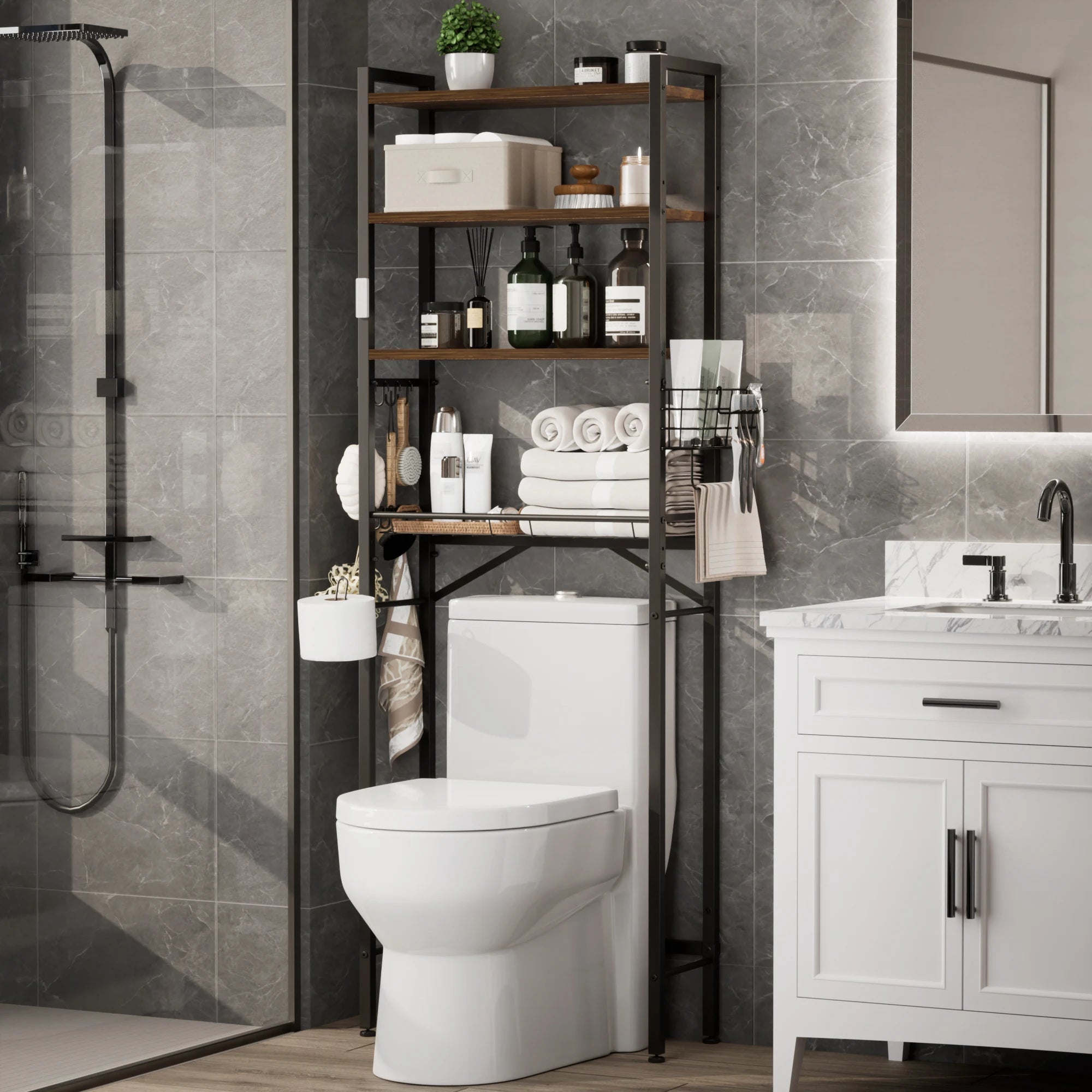 Maximize your bathroom’s potential with this intelligently designed Over-the-Toilet Organizer. Combining a sleek industrial look with practical flexibility, it transforms the wasted space above your toilet into a high-capacity storage center.