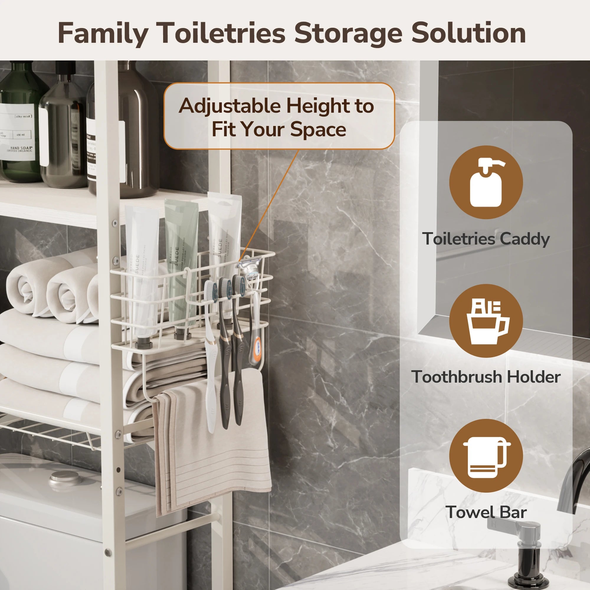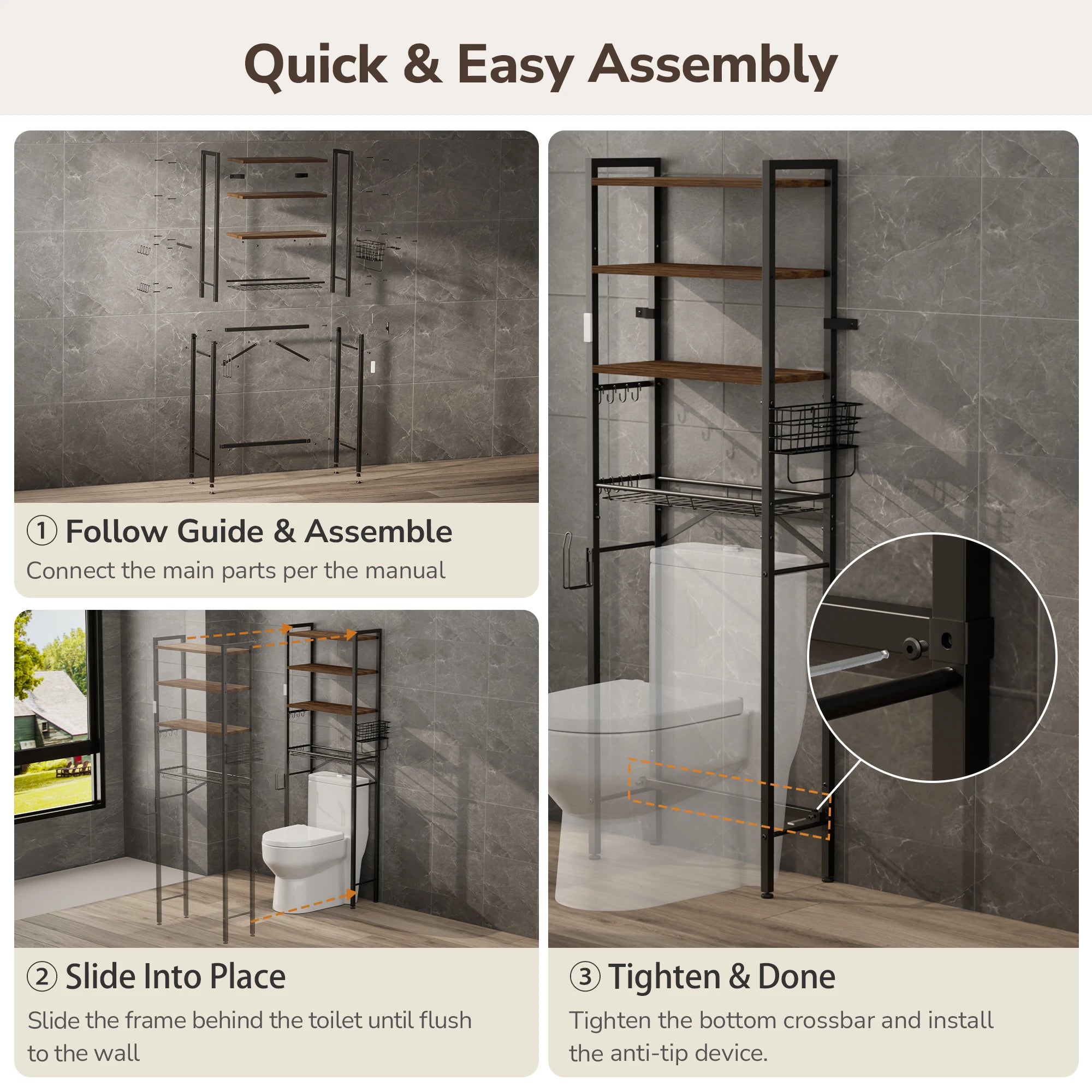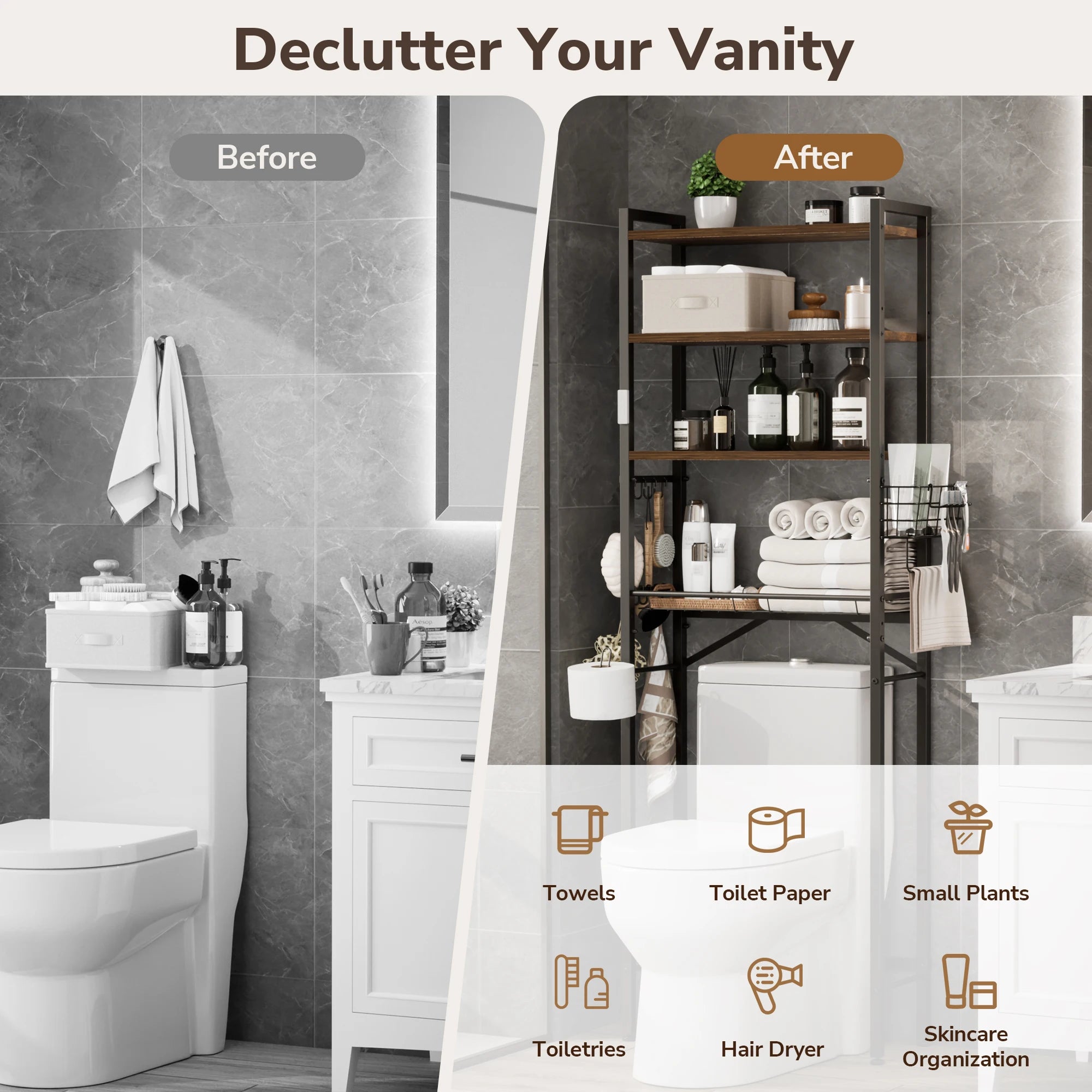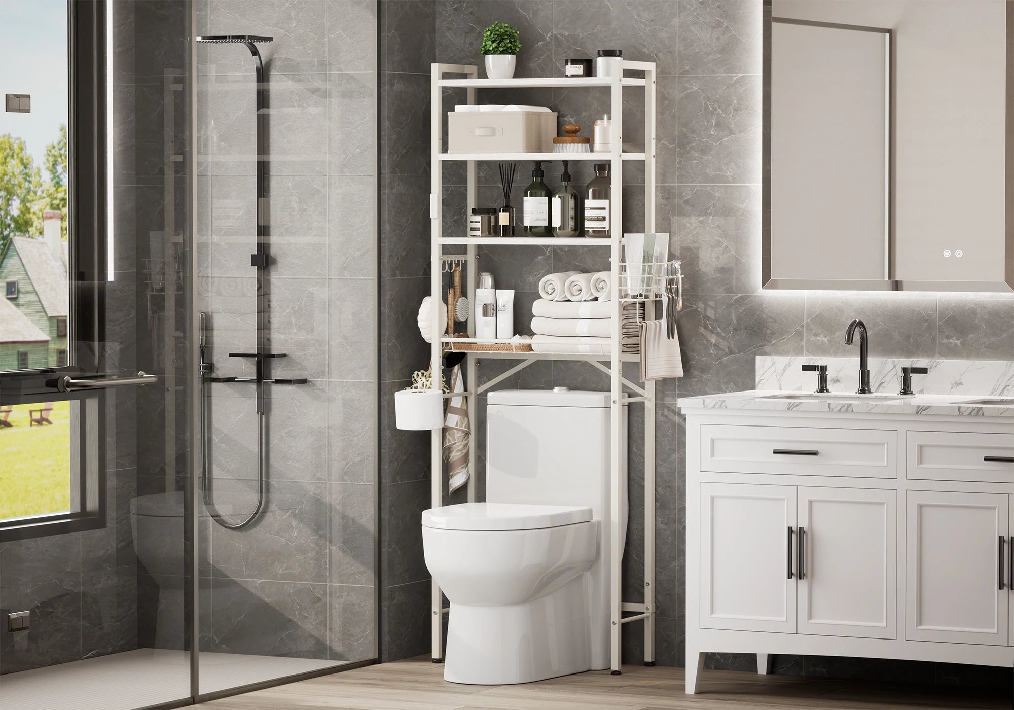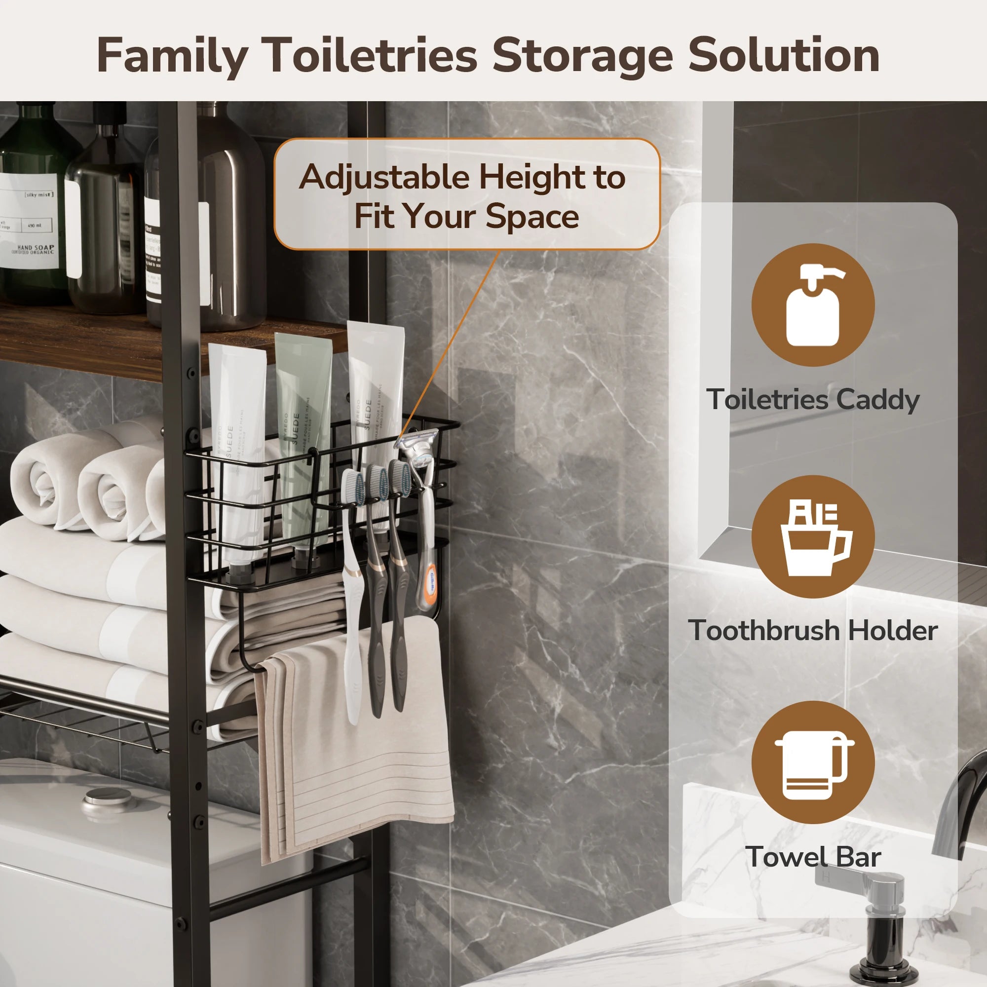 Maximize your bathroom’s potential with this intelligently designed Over-the-Toilet Organizer. Combining a sleek industrial look with practical flexibility, it transforms the wasted space above your toilet into a high-capacity storage center.