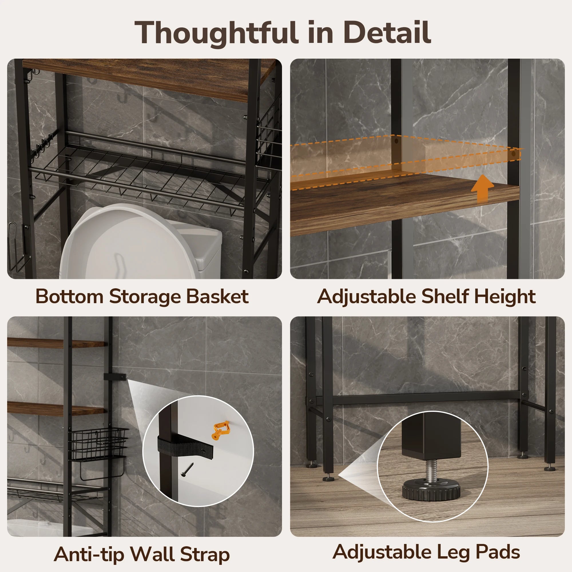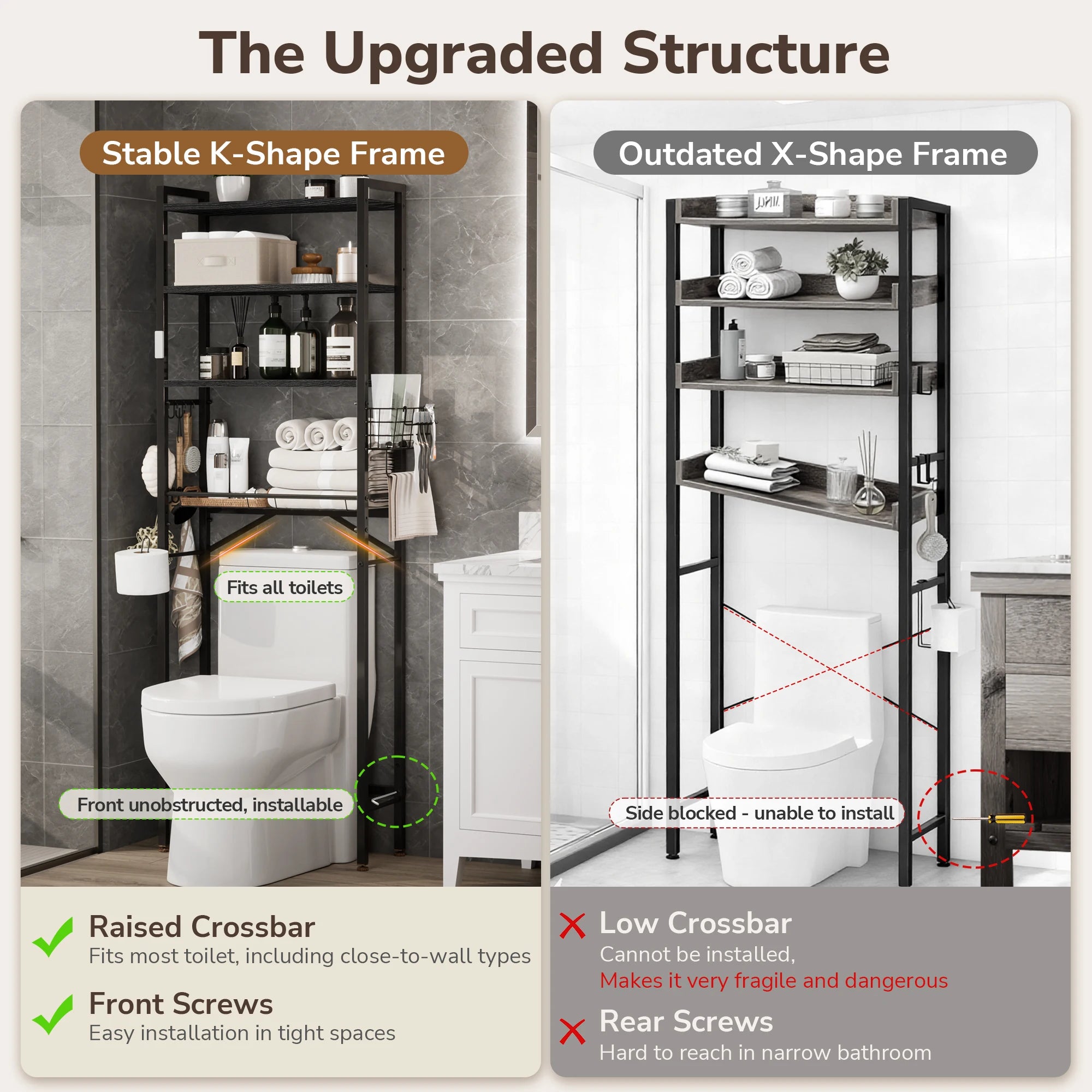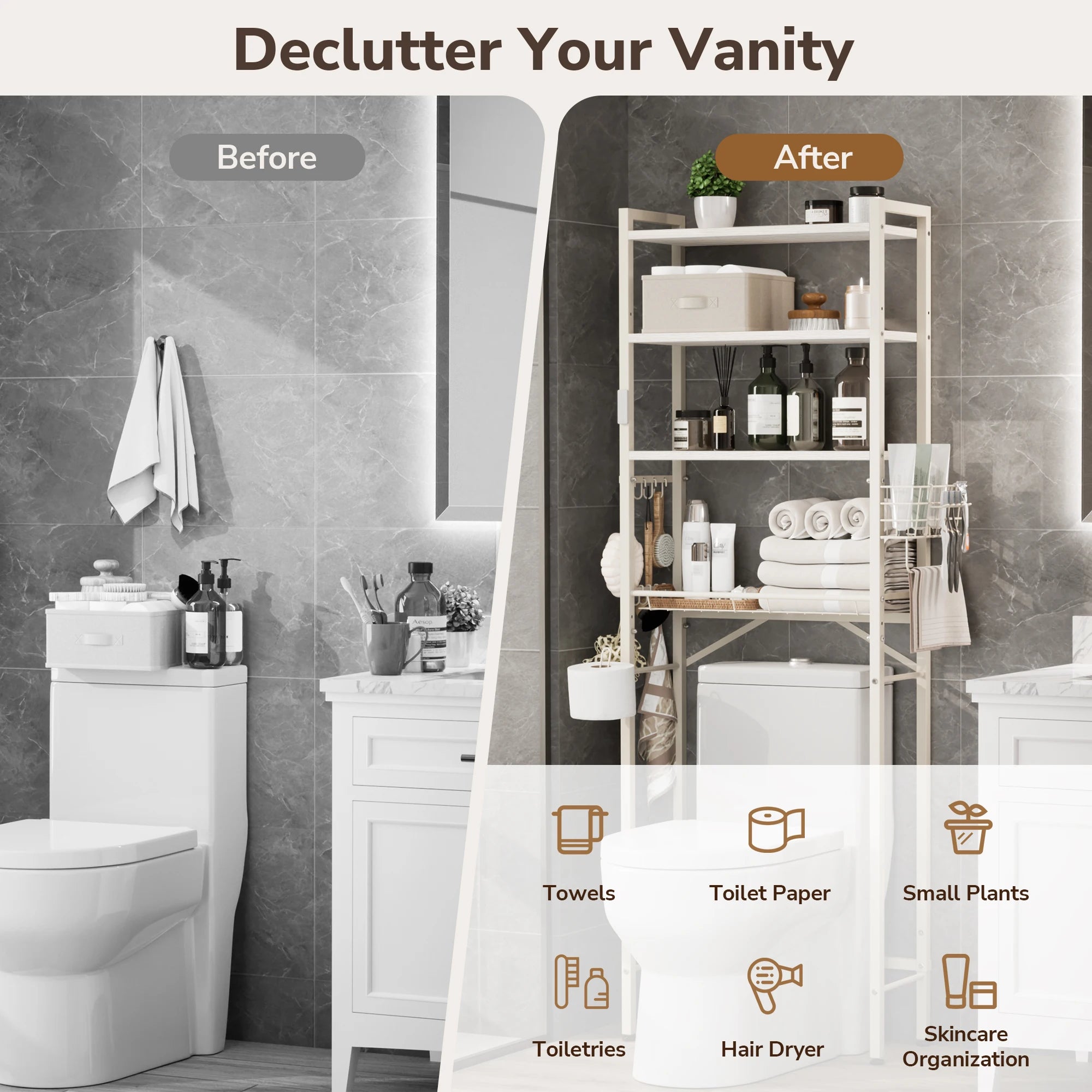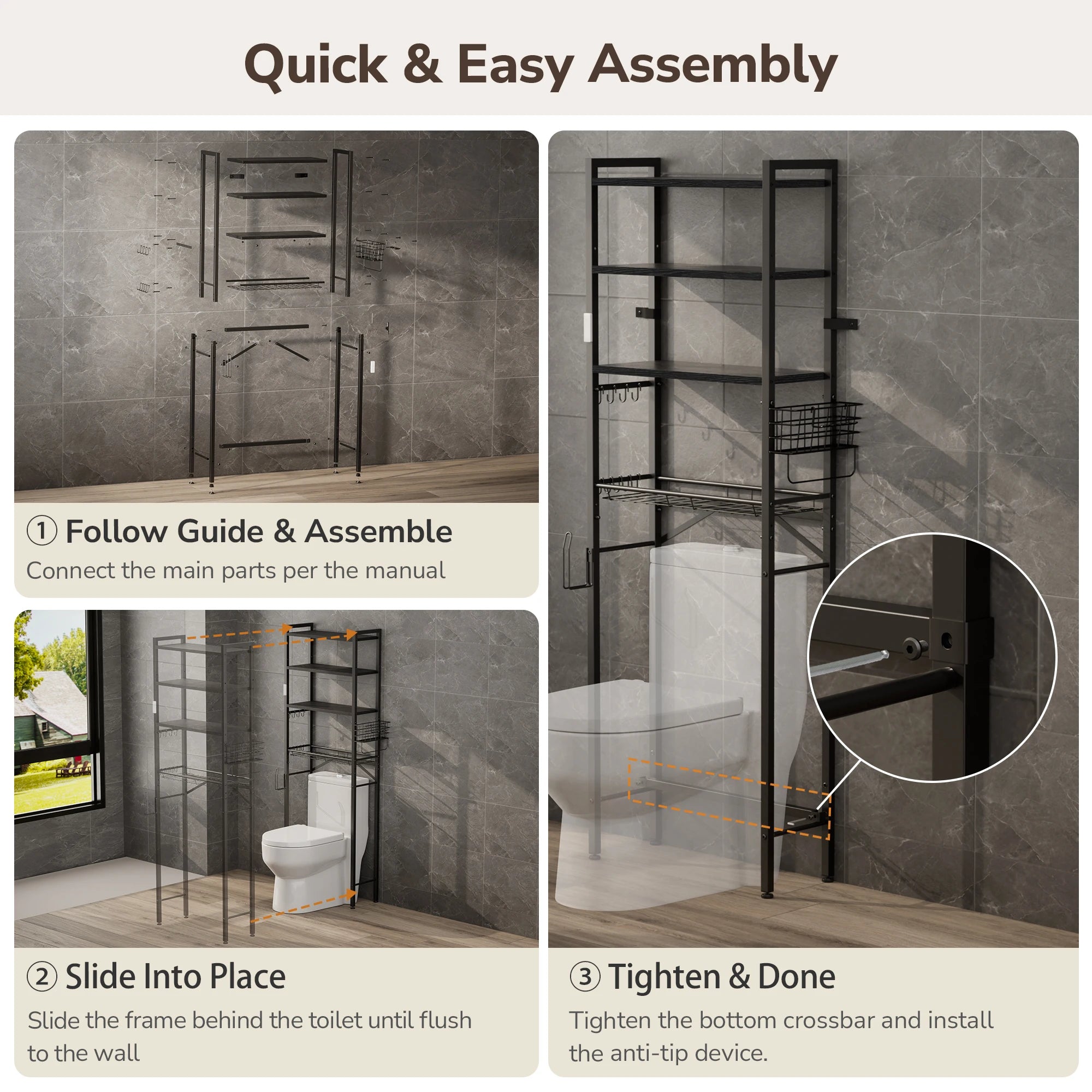 Maximize your bathroom’s potential with this intelligently designed Over-the-Toilet Organizer. Combining a sleek industrial look with practical flexibility, it transforms the wasted space above your toilet into a high-capacity storage center.