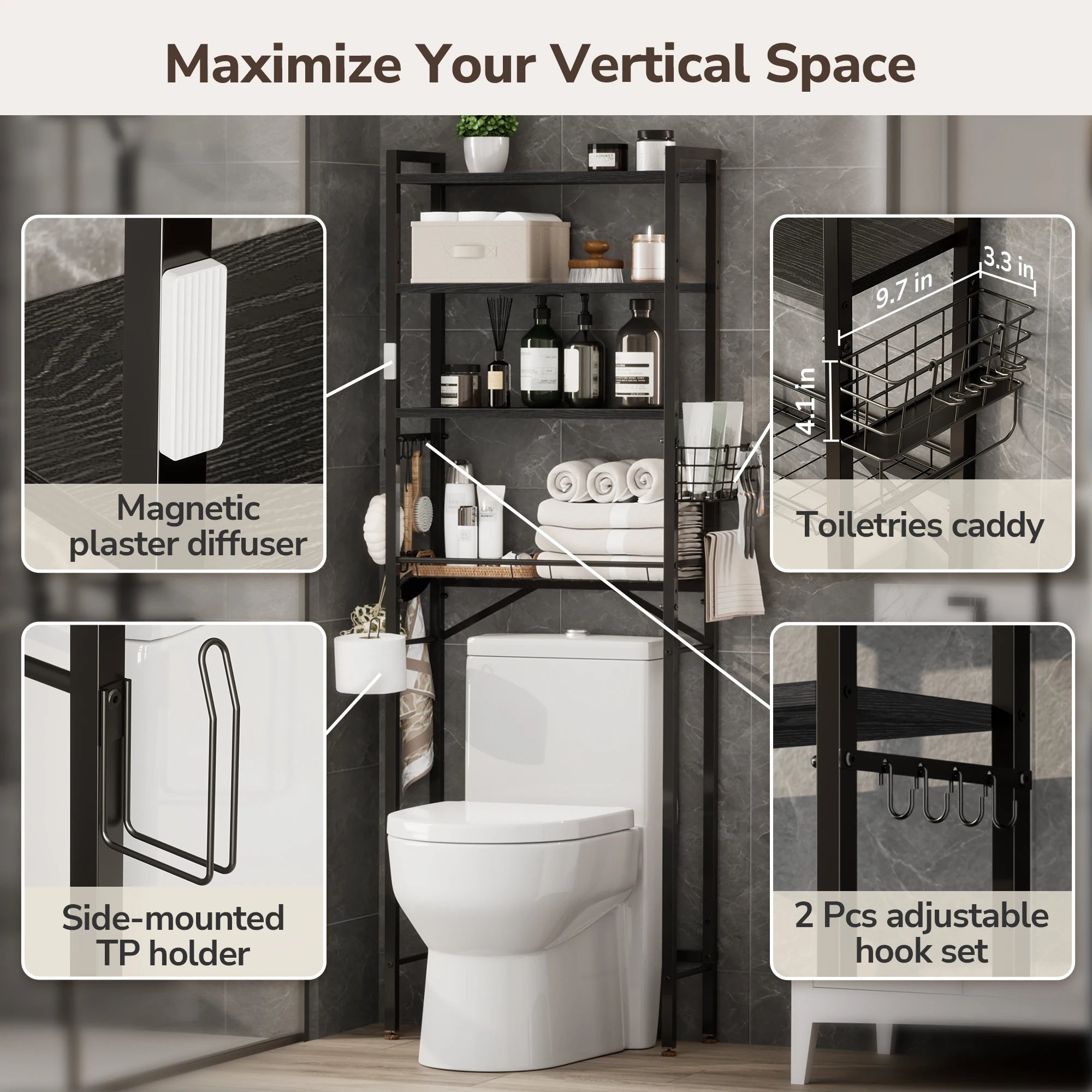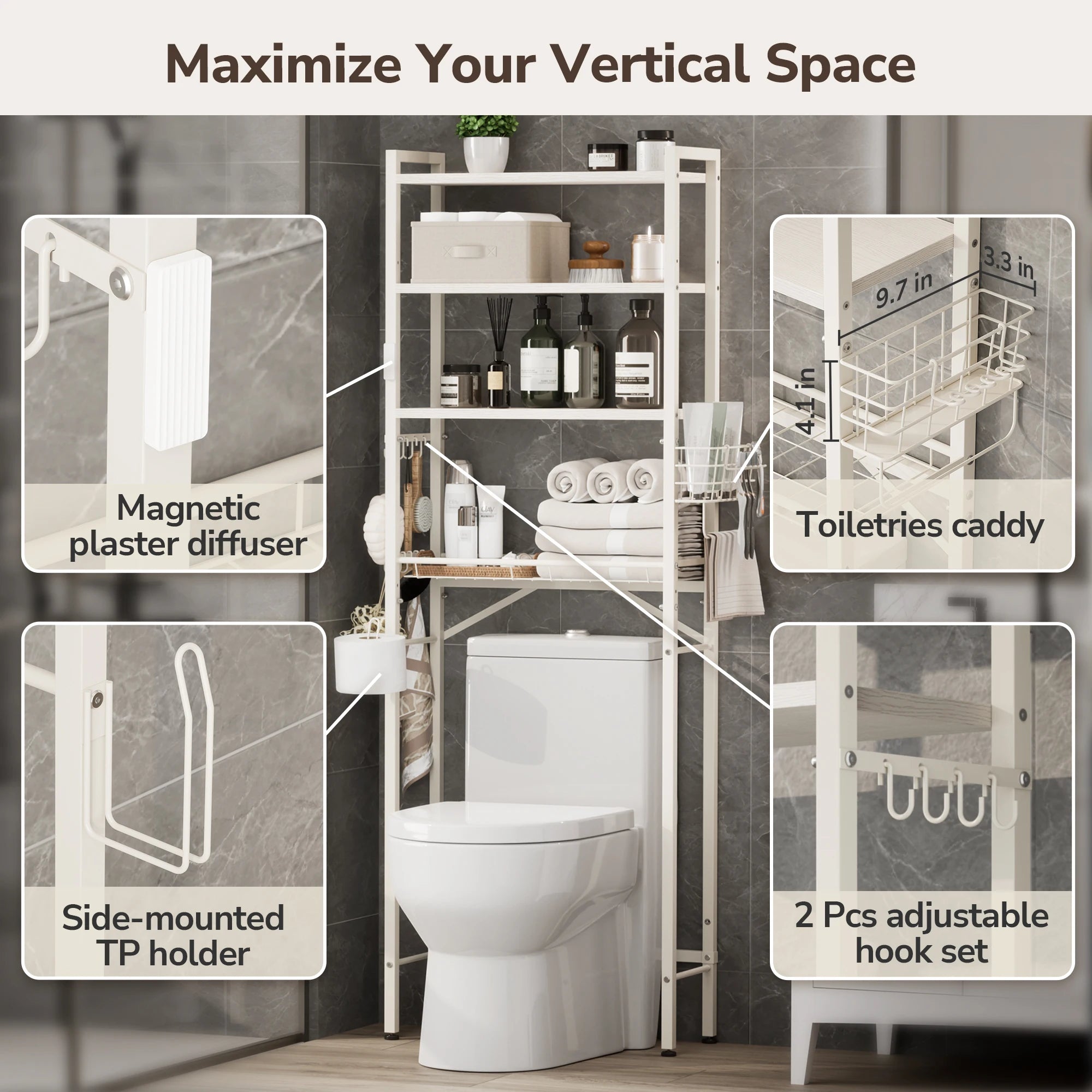 •  All-in-One Organization: Keep essentials within arm's reach. Comes equipped with a wire storage basket, side hooks, a toilet paper holder, and a magnetic accessory mount.
