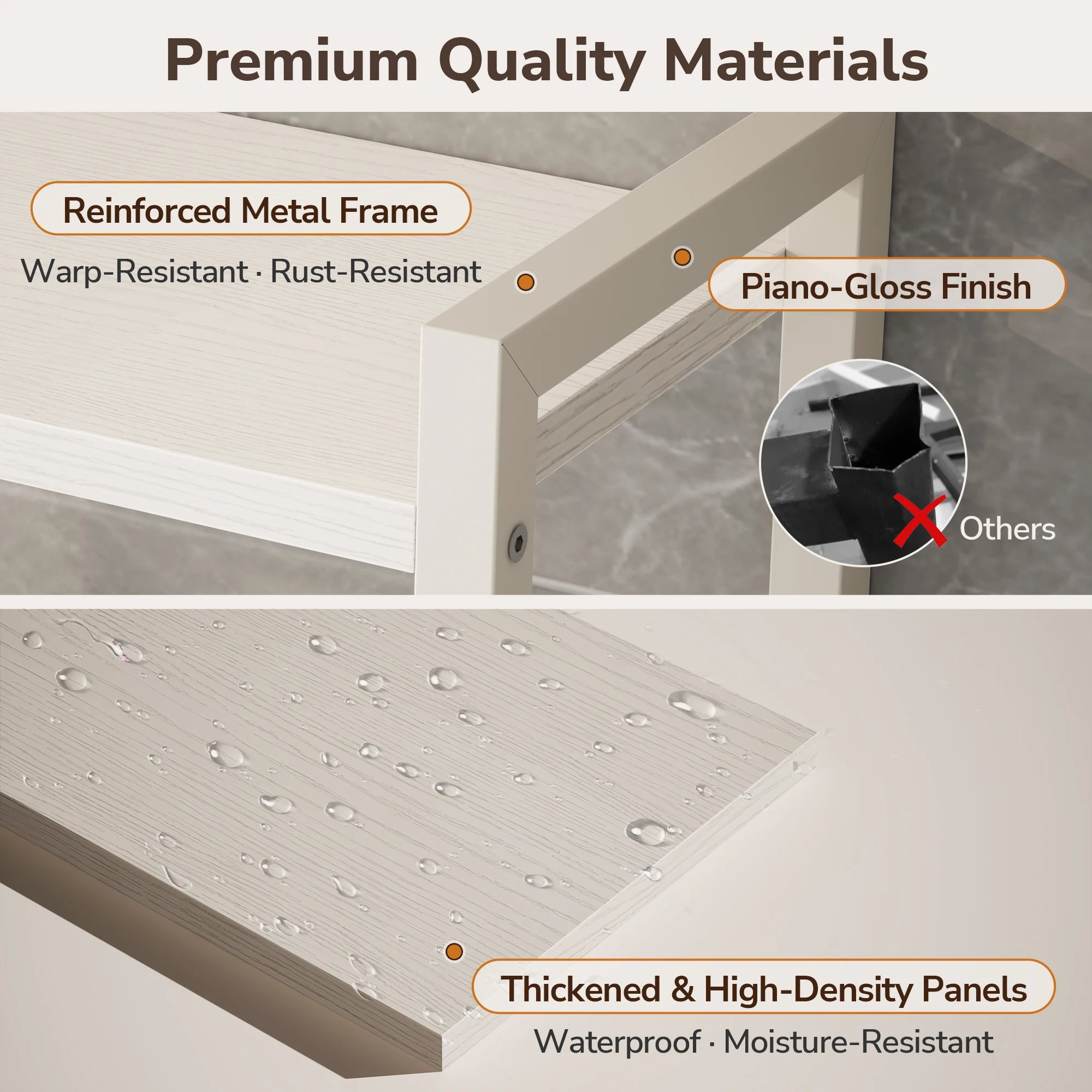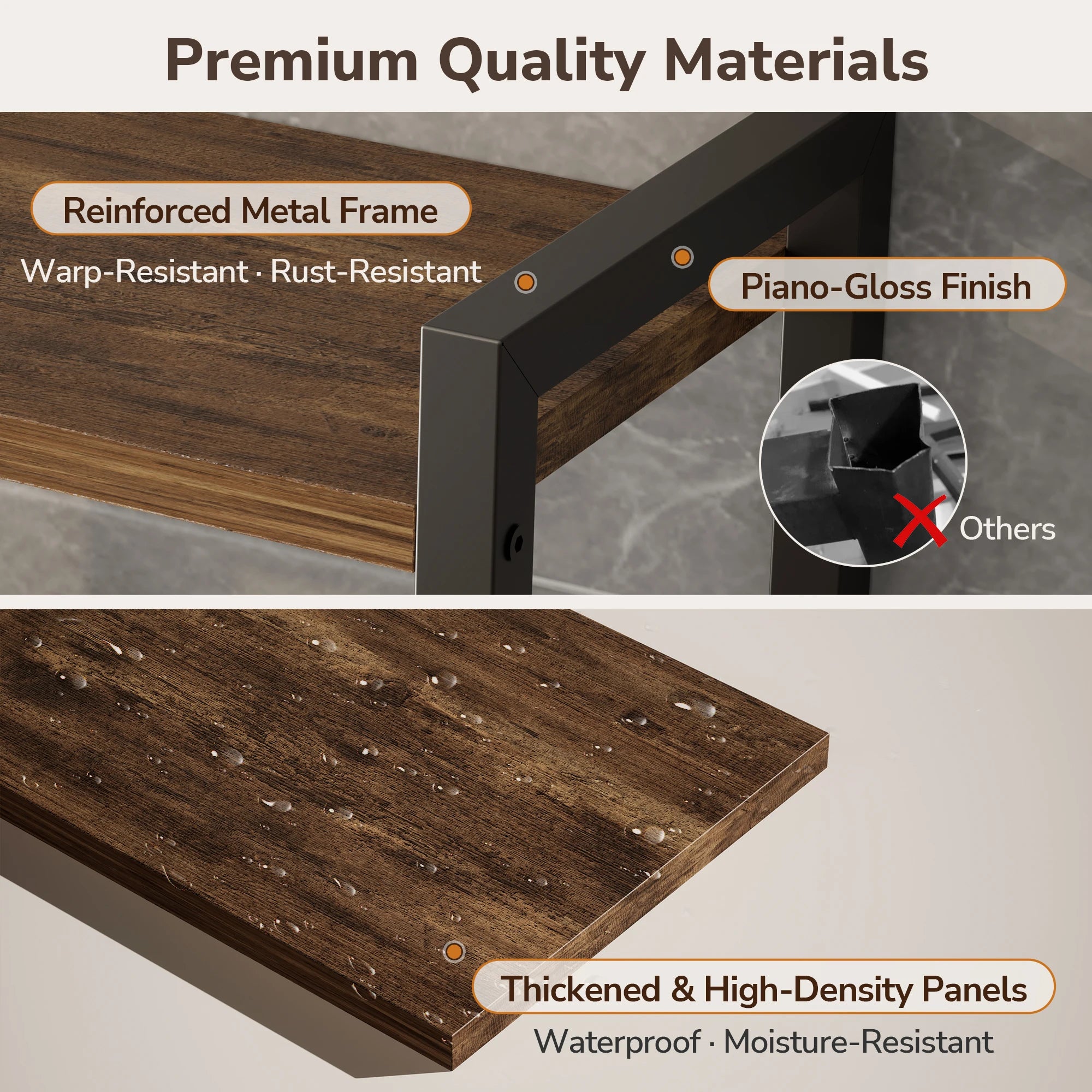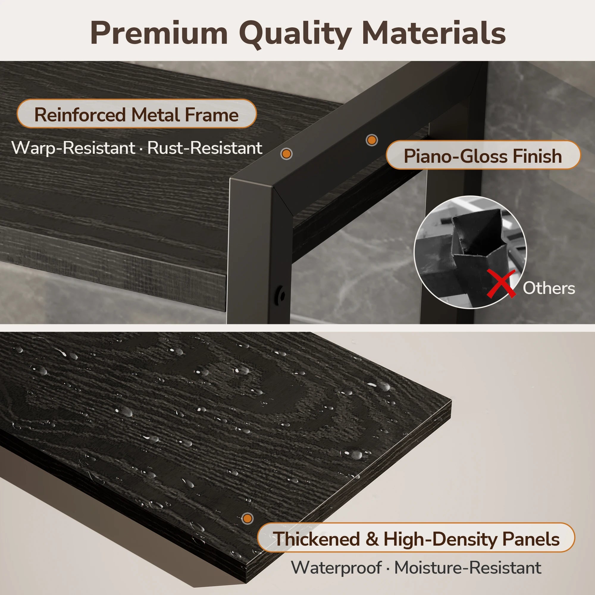 •  Premium & Durable Build: Crafted with a heavy-duty iron frame finished in premium piano lacquer for rust resistance. The shelves utilize triple-reinforced P2-grade waterproof particle board, making them easy to clean and built to last.