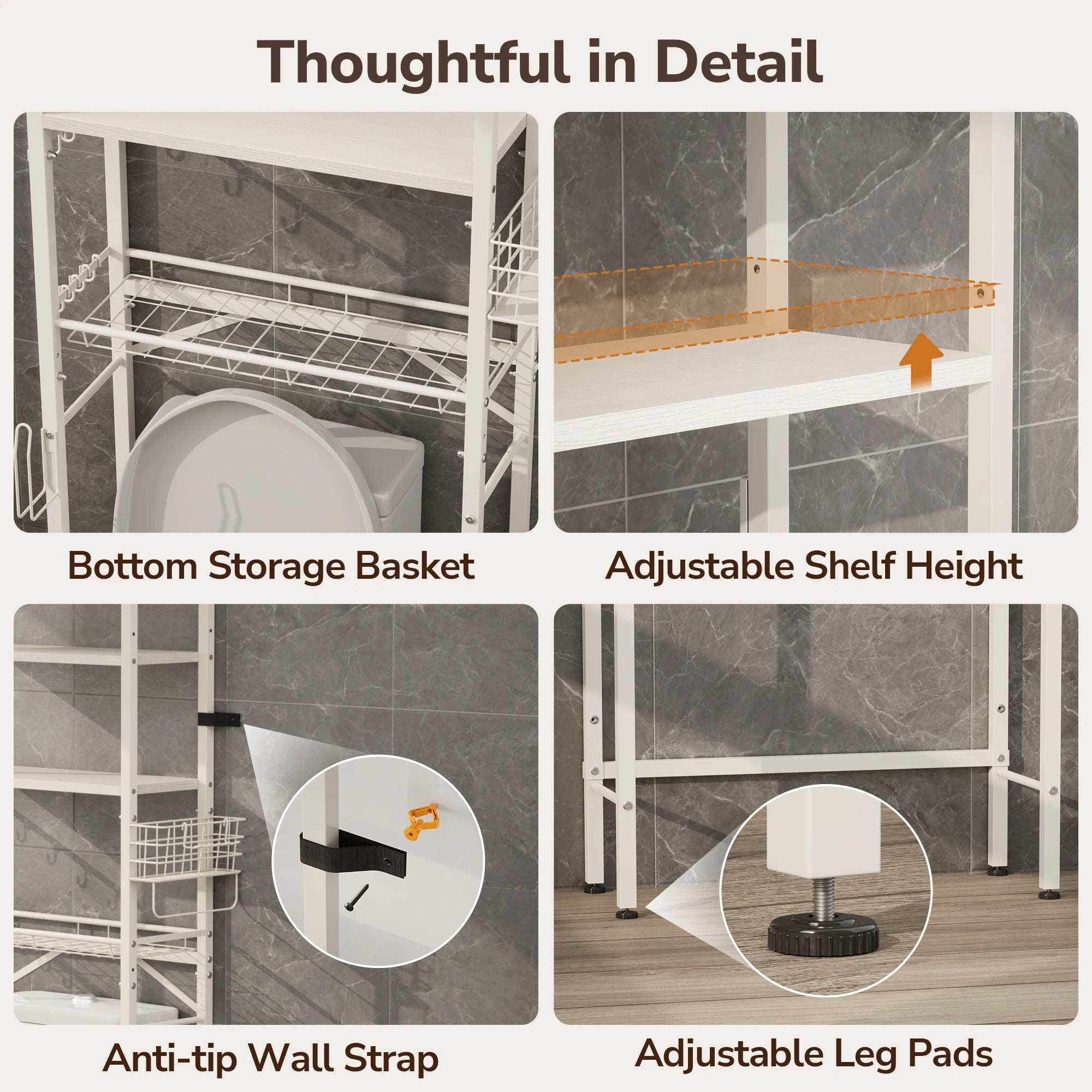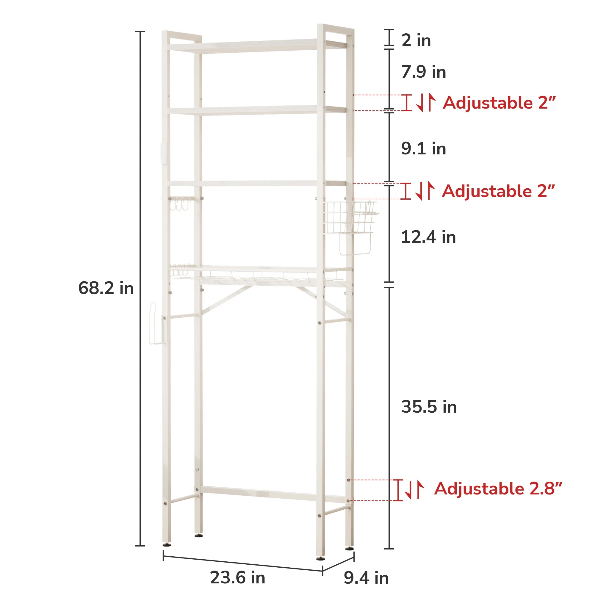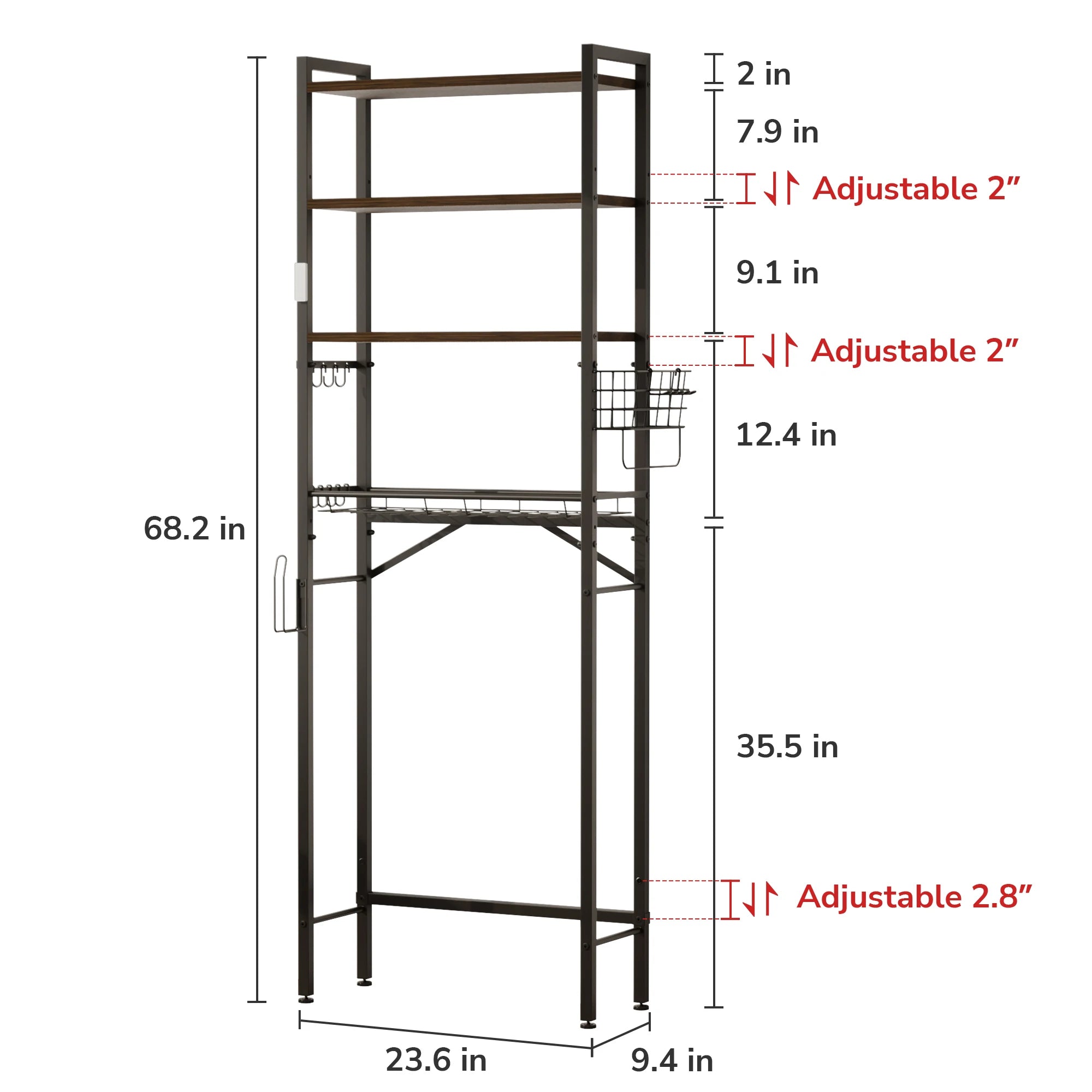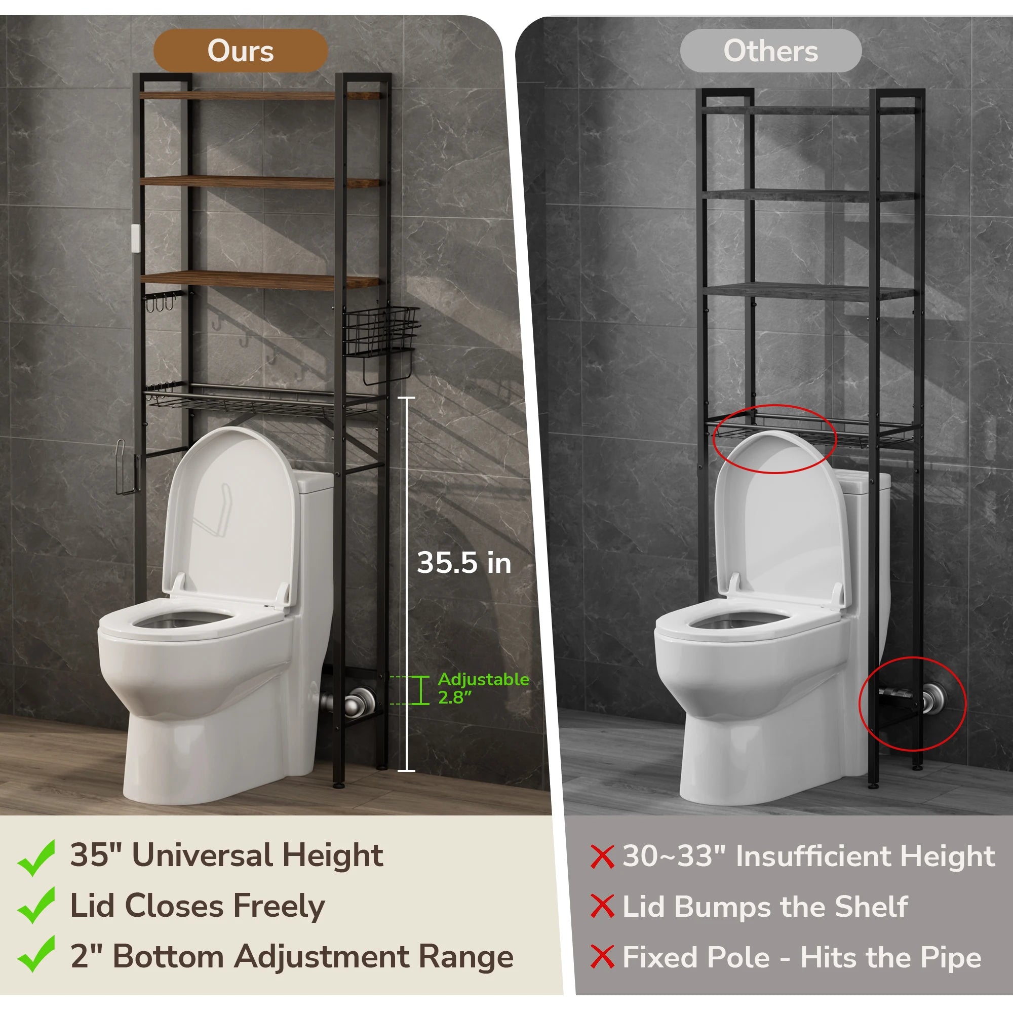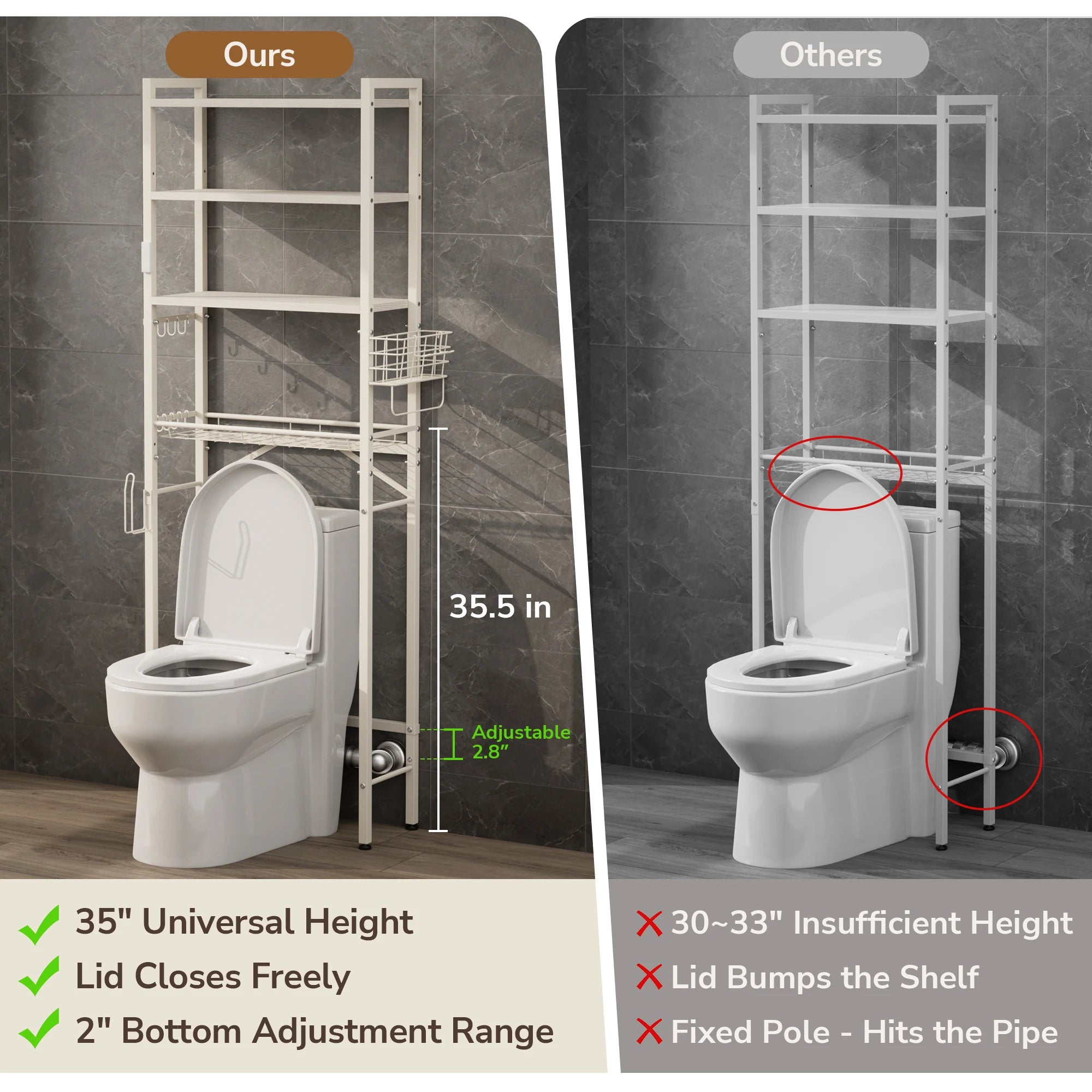 • Toilet Clearance: Approx. 35.5" height clearance from floor to first shelf.