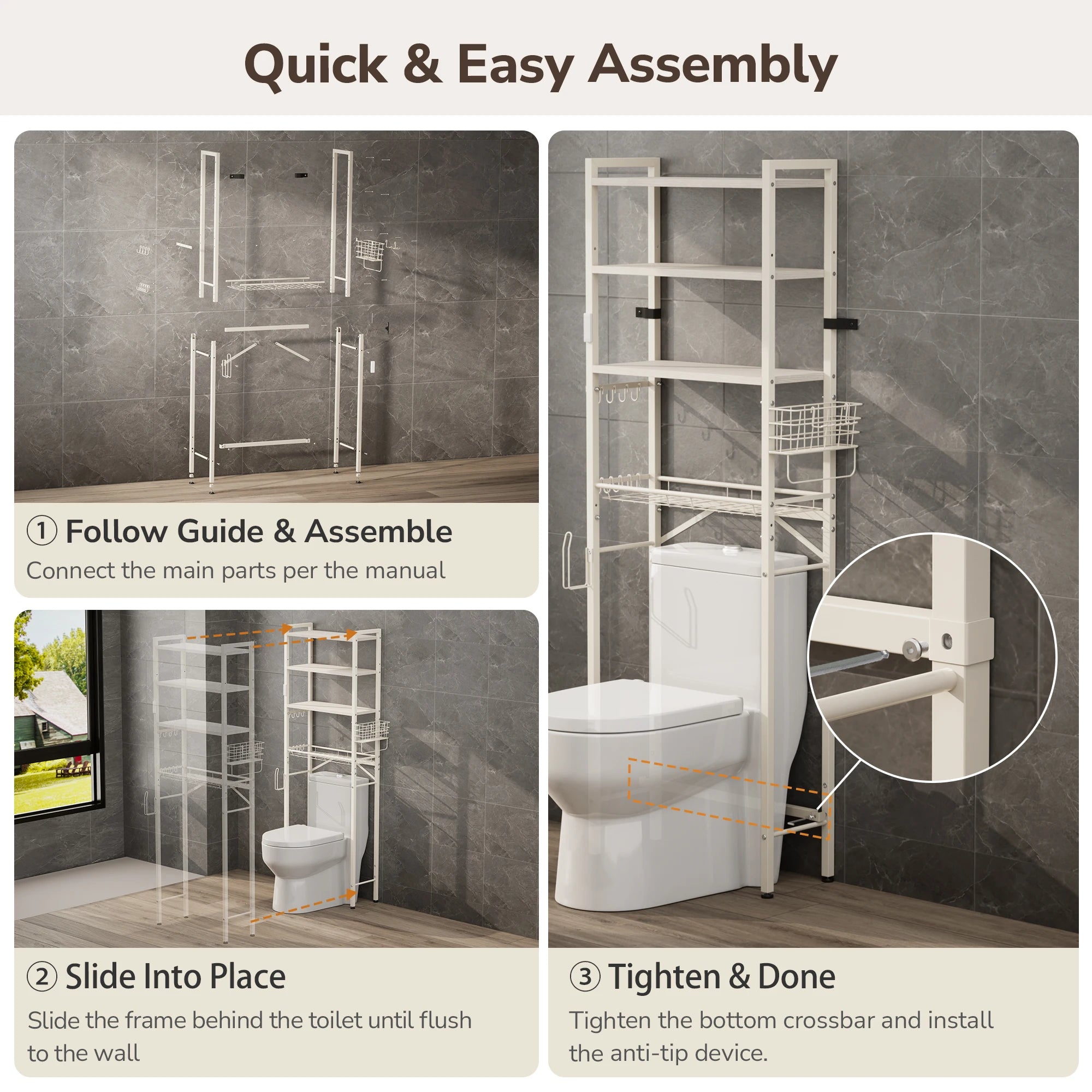 •  Easy Front-Access Assembly: Designed for hassle-free installation, even in cramped bathrooms. The front-access screws on the lower beam make setup quick and simple.